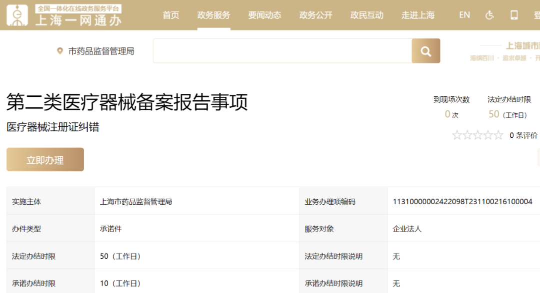 答:申请人可在上海市药品监督管理局官网(//yjj.sh.gov.cn)点击“一网通办”,在搜索栏中输入“第二类医疗器械备案报告事项”并选择“注册证纠错”,查看其办事指南,并按照指南在线申请。