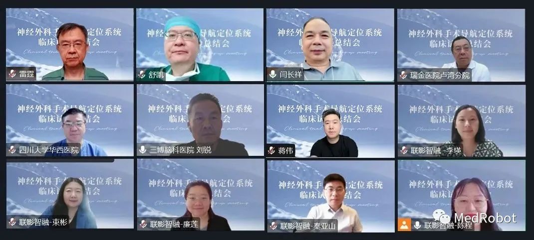 近日,联影智融神经外科手术导航定位系统临床试验总结会线上举办。华中科技大学同济医学院附属同济医院雷霆主任、舒凯教授、蒋伟副教授、胡峰副教授和吴世强老师,首都医科大学三博脑科医院闫长祥副院长和刘锐教授,上海交通大学医学院附属瑞金医院卢湾分院徐纪文教授,四川大学华西医院王伟主任及其团队,联影智融各个业务部门等在线参会。