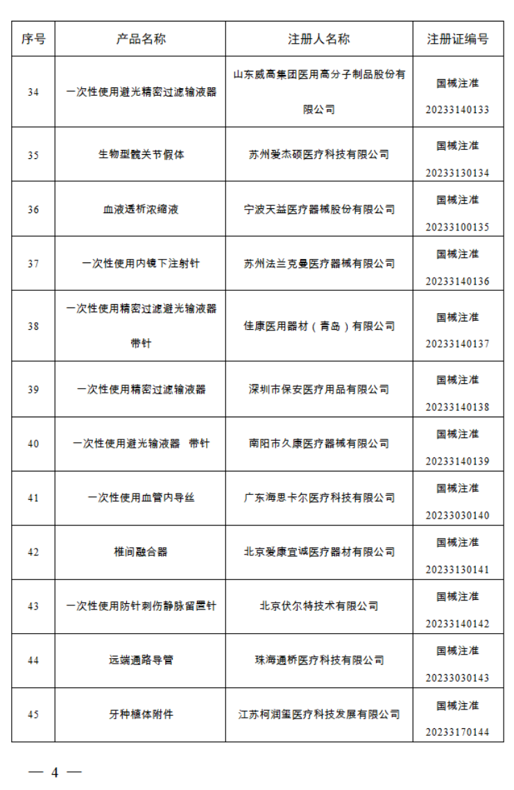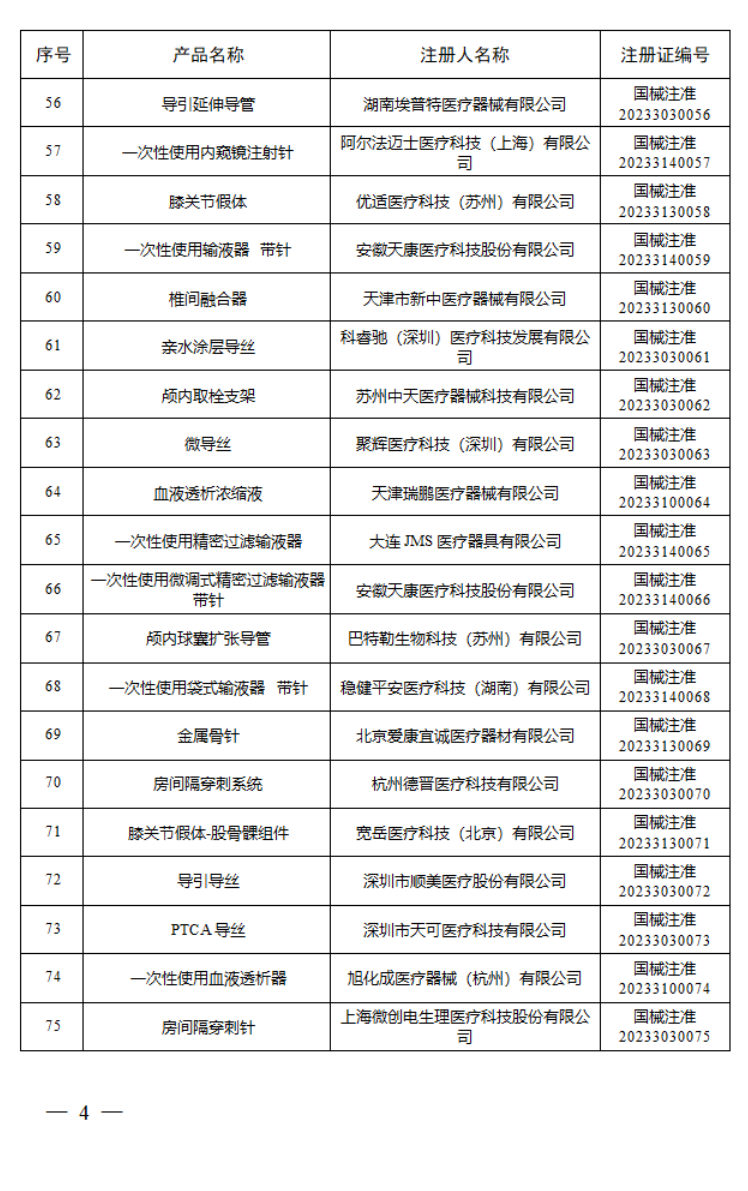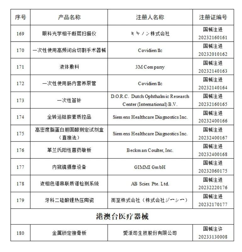 2023年4月,国家药监局共批准注册医疗器械产品180个。其中,境内第三类医疗器械产品125个,进口第三类医疗器械产品21个,进口第二类医疗器械产品33个,港澳台医疗器械产品1个。