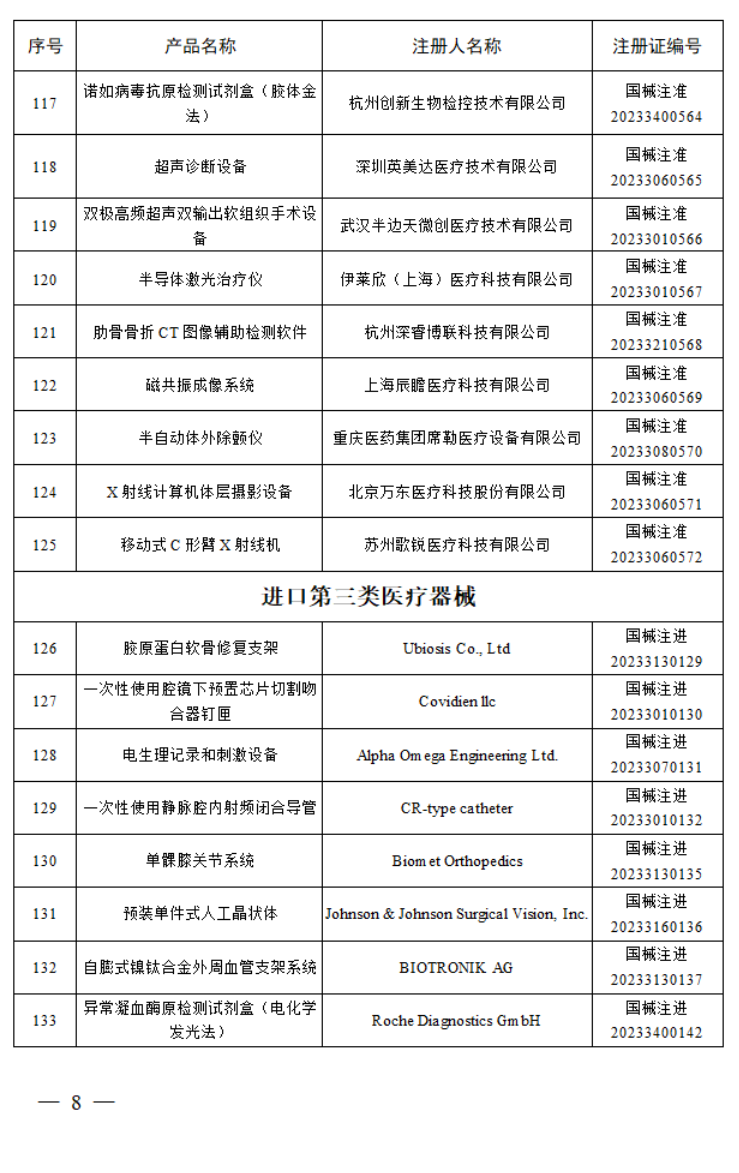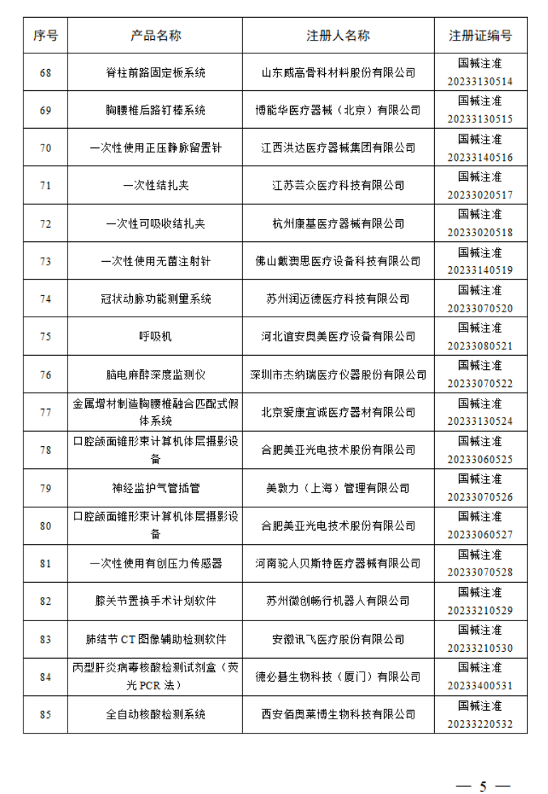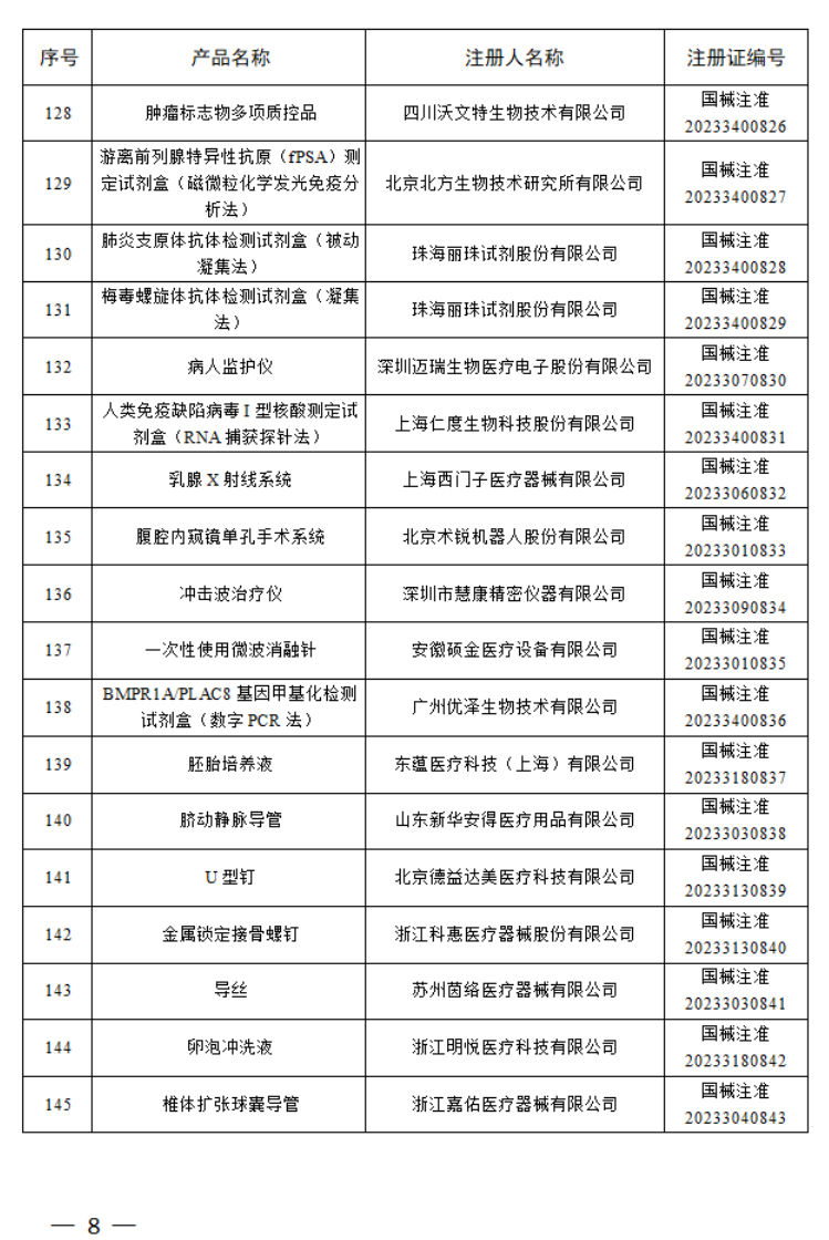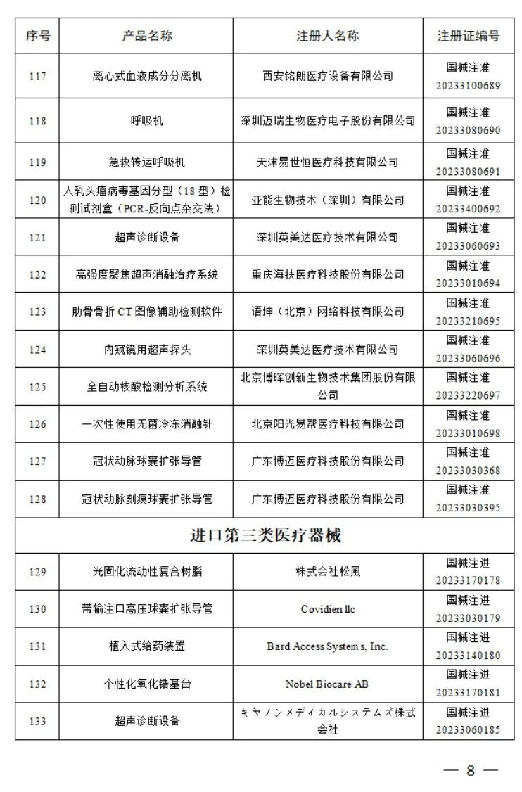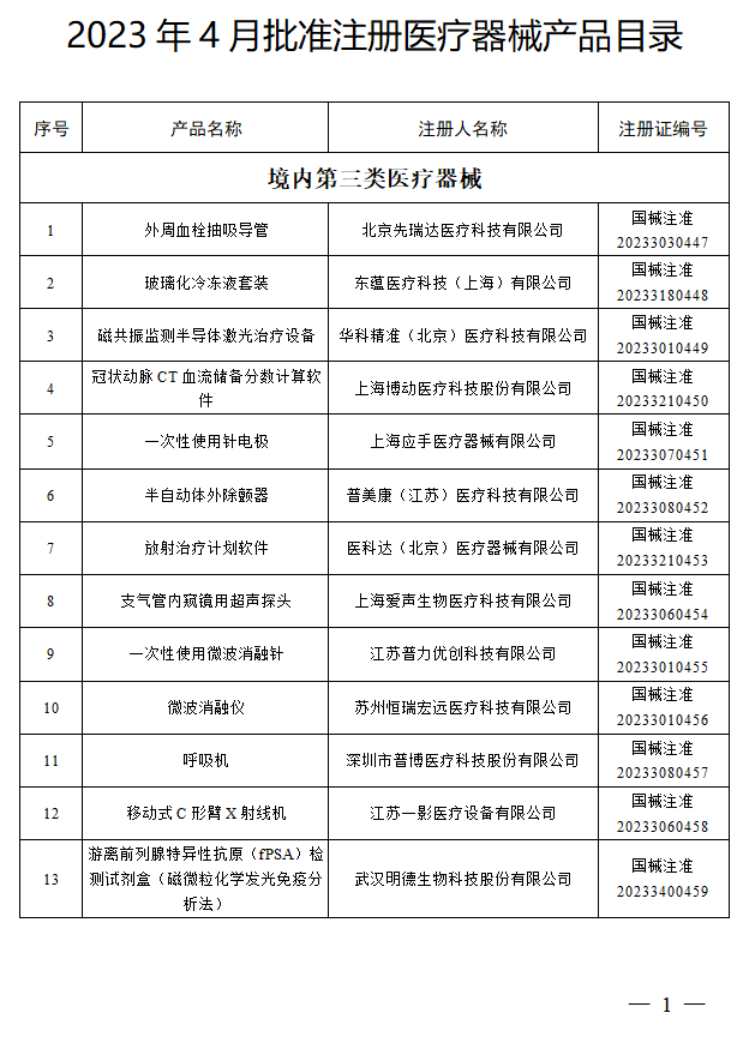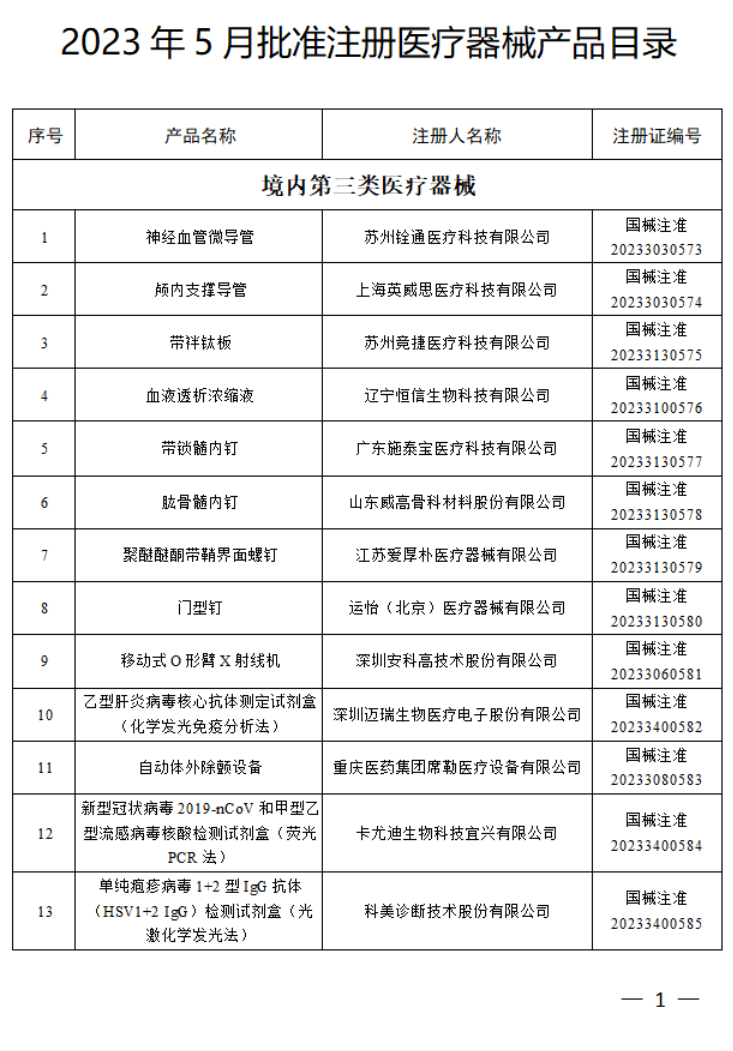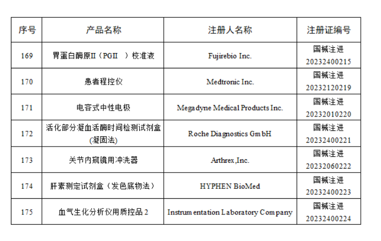 2023年5月,国家药监局共批准注册医疗器械产品175个。其中,境内第三类医疗器械产品128个,进口第三类医疗器械产品27个,进口第二类医疗器械产品20个。