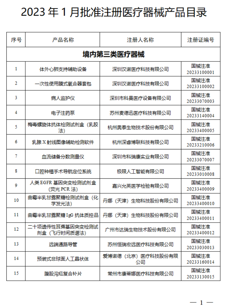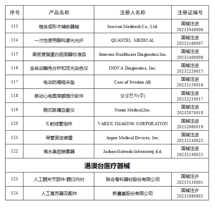 2023年1月,国家药监局共批准注册医疗器械产品124个。其中,境内第三类医疗器械产品99个,进口第三类医疗器械产品11个,进口第二类医疗器械产品12个,港澳台医疗器械产品2个。