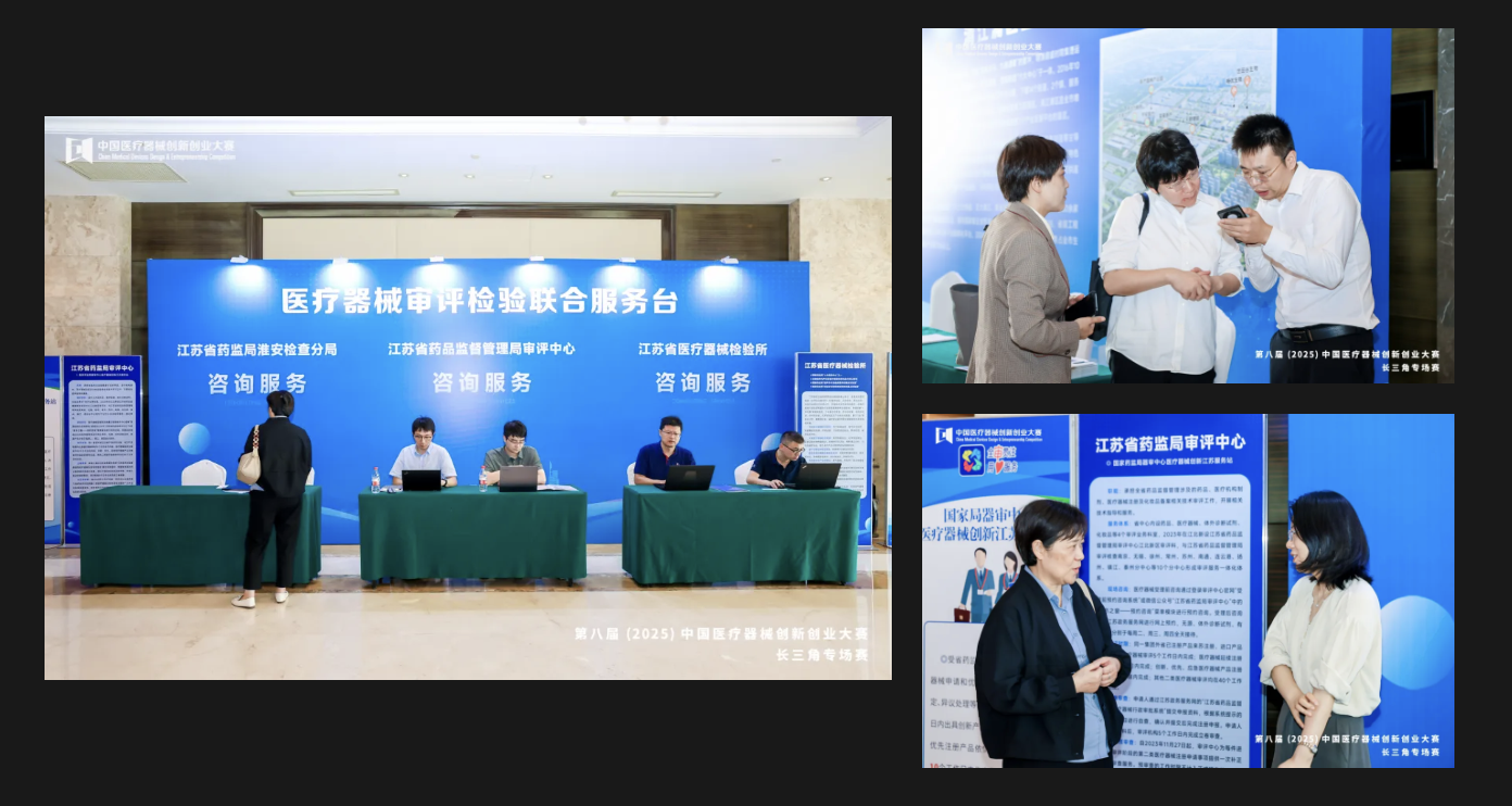此外,为了更好地服务于参赛企业和项目团队,赛事期间特别增设了江苏省药监局淮安检查分局、江苏省药监局评审中心、江苏省医疗器械检验所等多家一站式咨询服务,帮助参赛团队解决实际问题,加快项目落地进程。