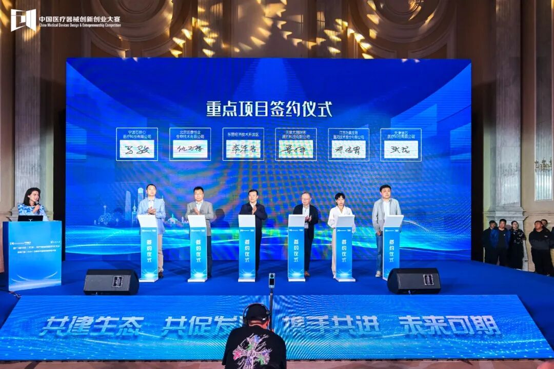 活动现场还举行了高端医疗器械项目落地签约仪式。东丽经开区党工委副书记、管委会主任李泽岩与宁波芯联心医疗、江苏为真生物、北京运康恒业、天津慧芯医疗、天津尤图瑞思医药的企业代表共同签署合作协议。据介绍,宁波芯联心拟投资 3800 万元建肺动脉监测系统研发制造基地,其余企业也将分别在东丽经开区落地唾液尿酸检测试剂研发生产、同种异体骨植入物、血流动力检测系统、E7 蛋白检测试剂盒生产等项目。